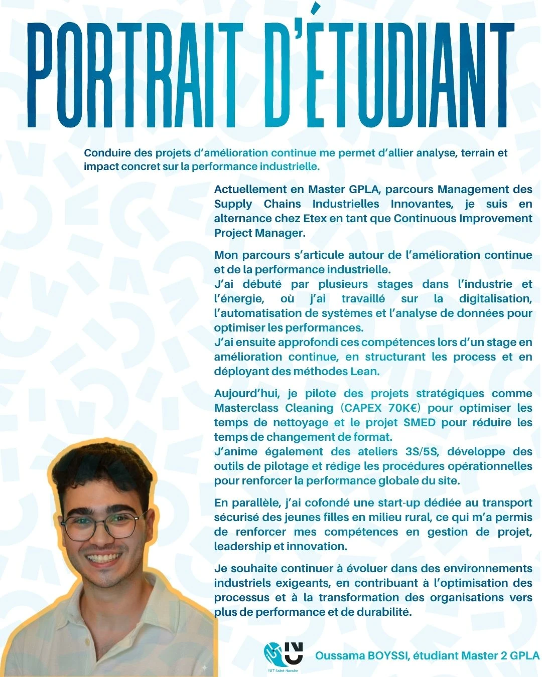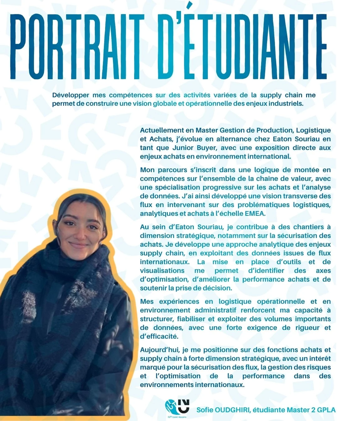 Parcourez les portraits de la série " #VisagesDeLIUT- Plongez au coeur de celles et ceux qui donnent vie à nos formations " , inspirez-vous de leurs parcours et découvrez celles et ceux qui font vibrer l’IUT au quotidien.